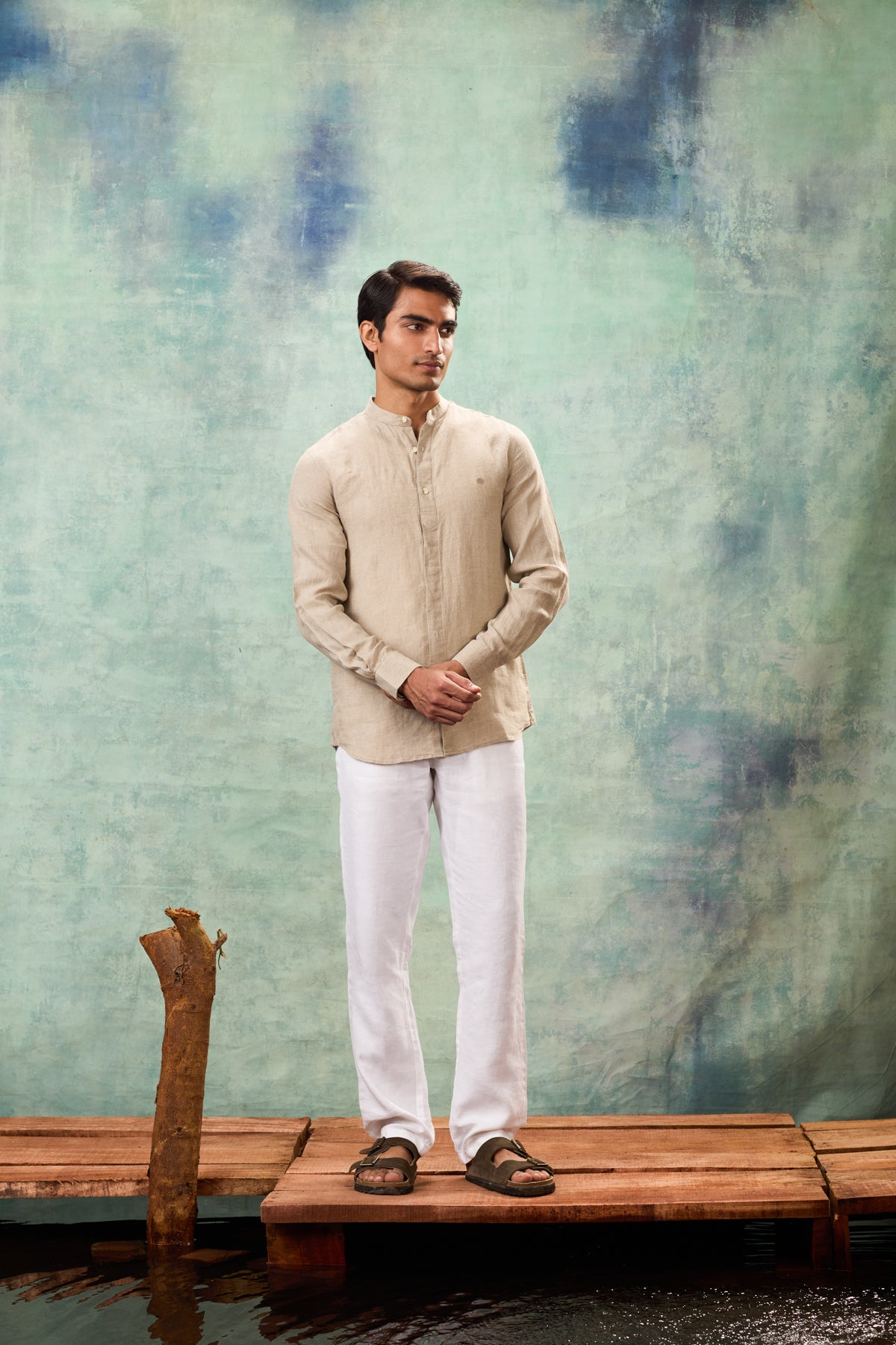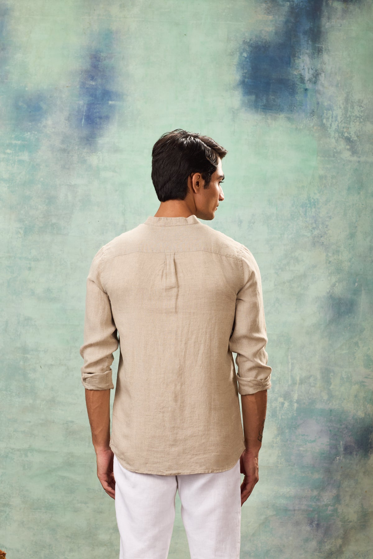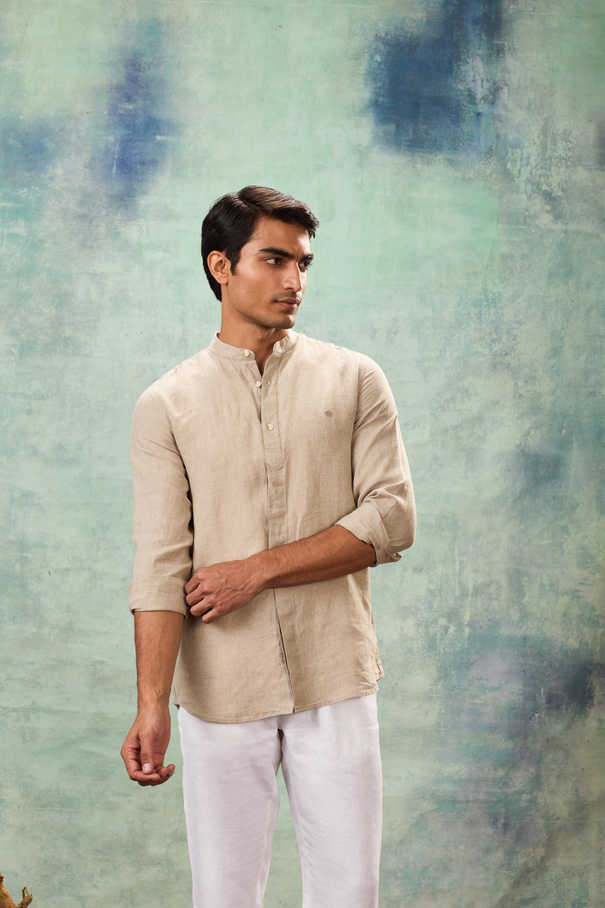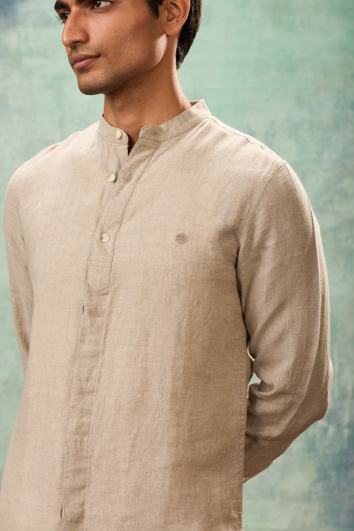 Beige Full Sleeve Mandarin Collar Shirt