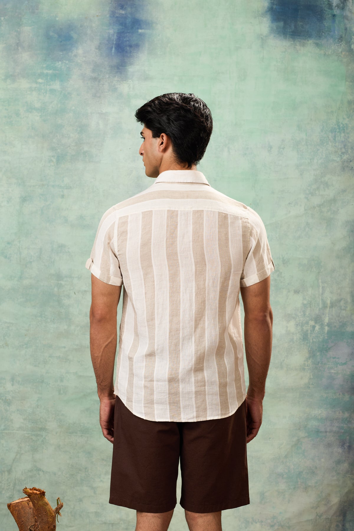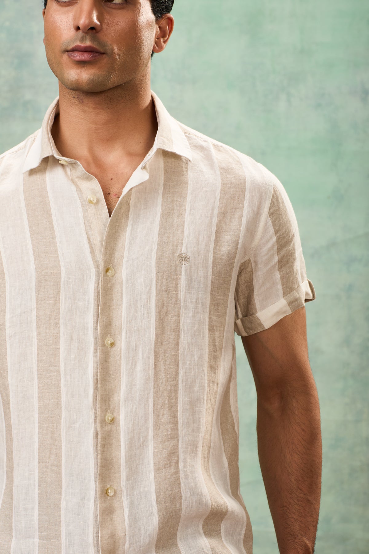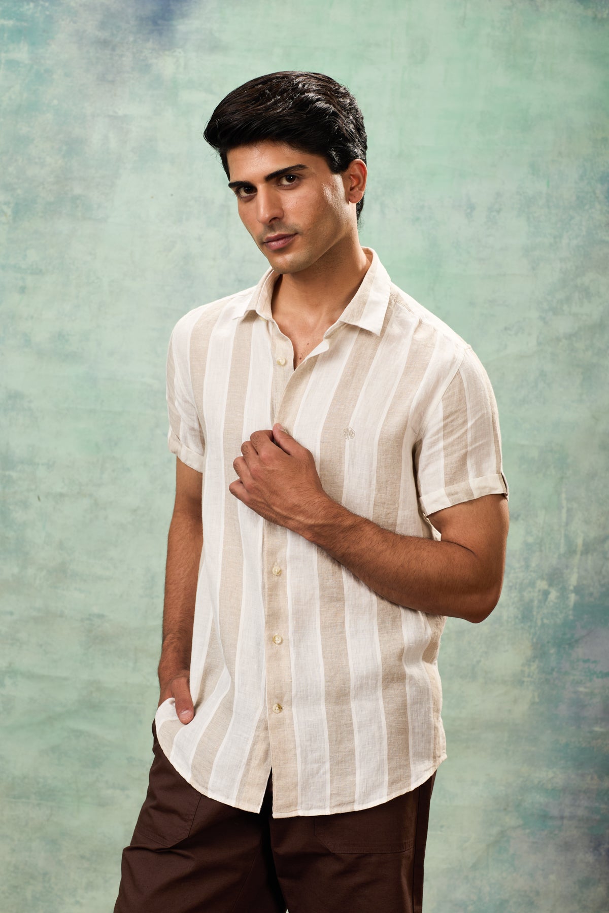 Experience effortless elegance with this beige half sleeve shirt, featuring subtle striped detailing that elevates its casual design. Perfect for vacation or relaxed outings, it offers both comfort and sophistication, making it an ideal choice for refined yet laid-back style.