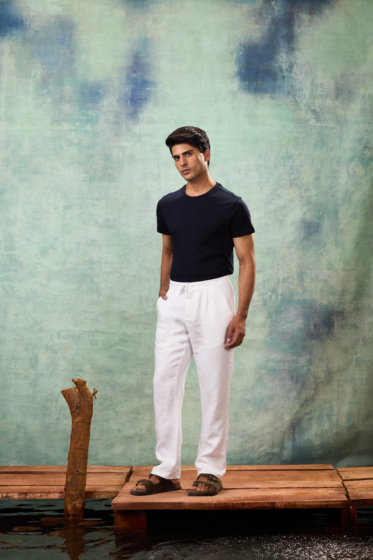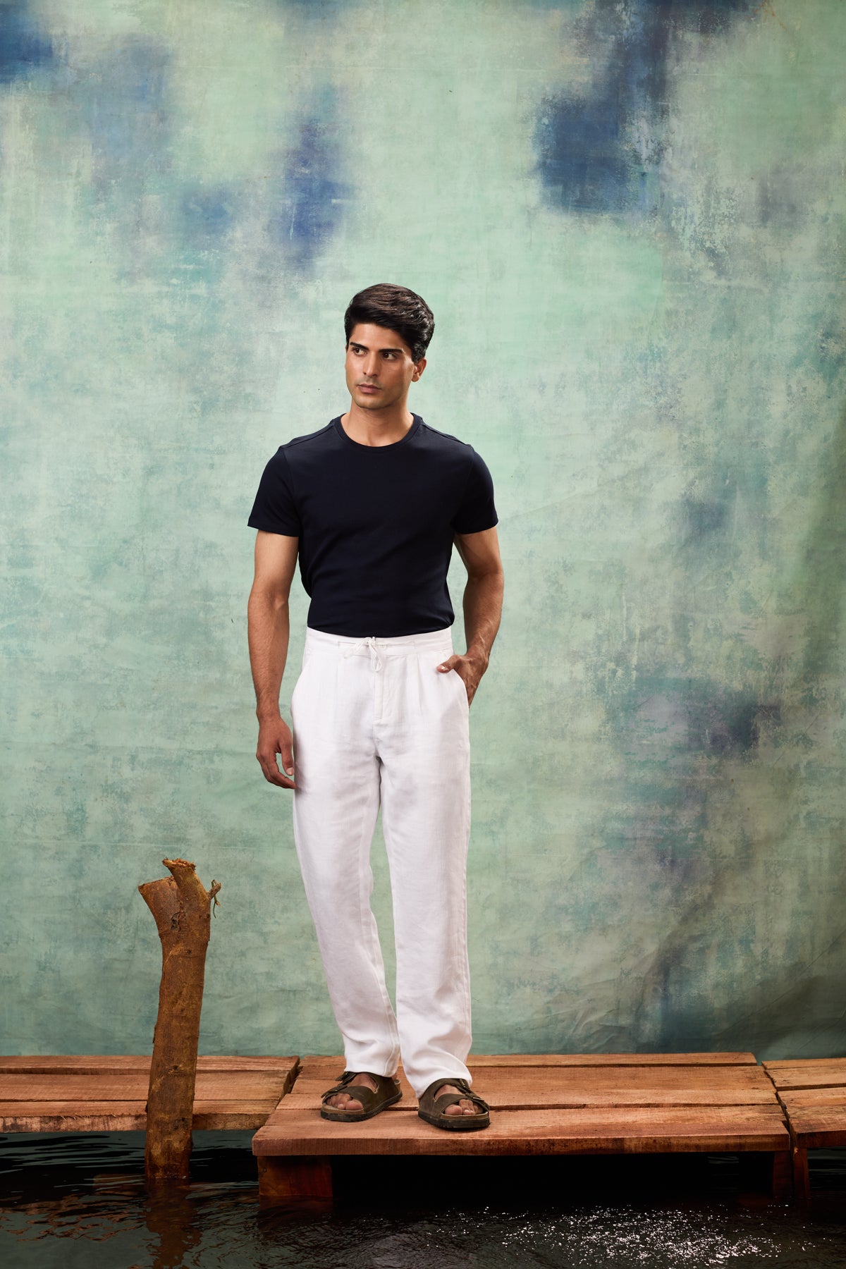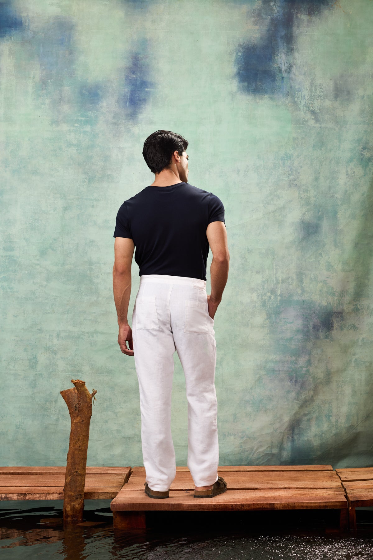 These drawstring trousers combine comfort and refinement with a relaxed fit and elegant pleated front. Featuring practical cross pockets and back patch pockets, they offer both style and functionality. The subtle signature logo embroidery adds a touch of distinction, making these trousers a versatile addition to a polished wardrobe.
